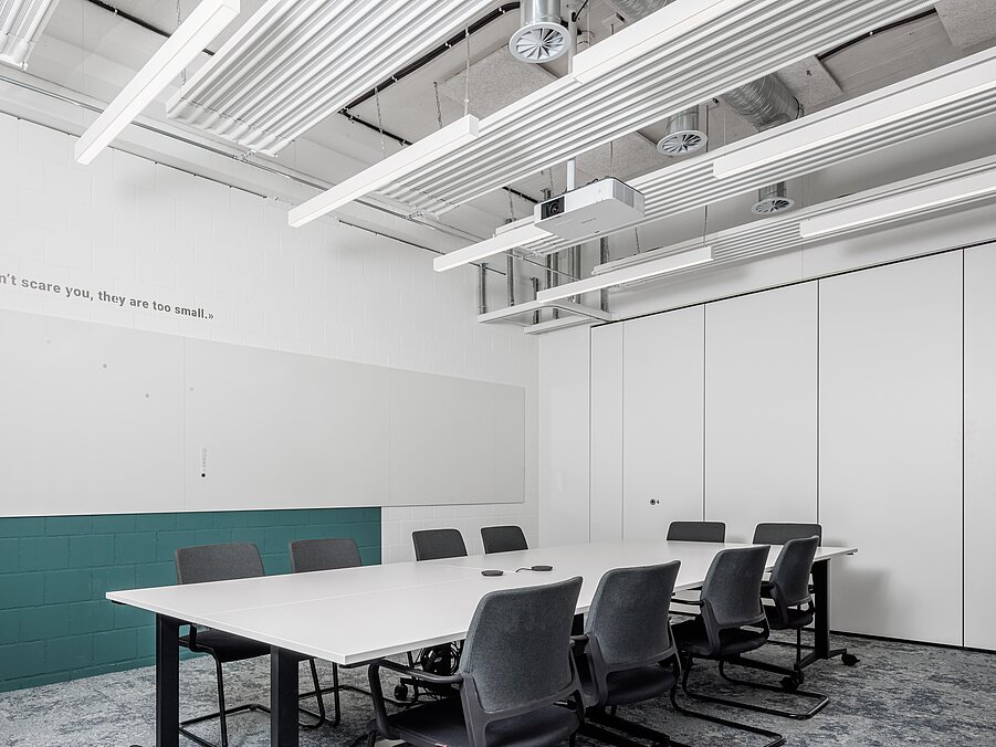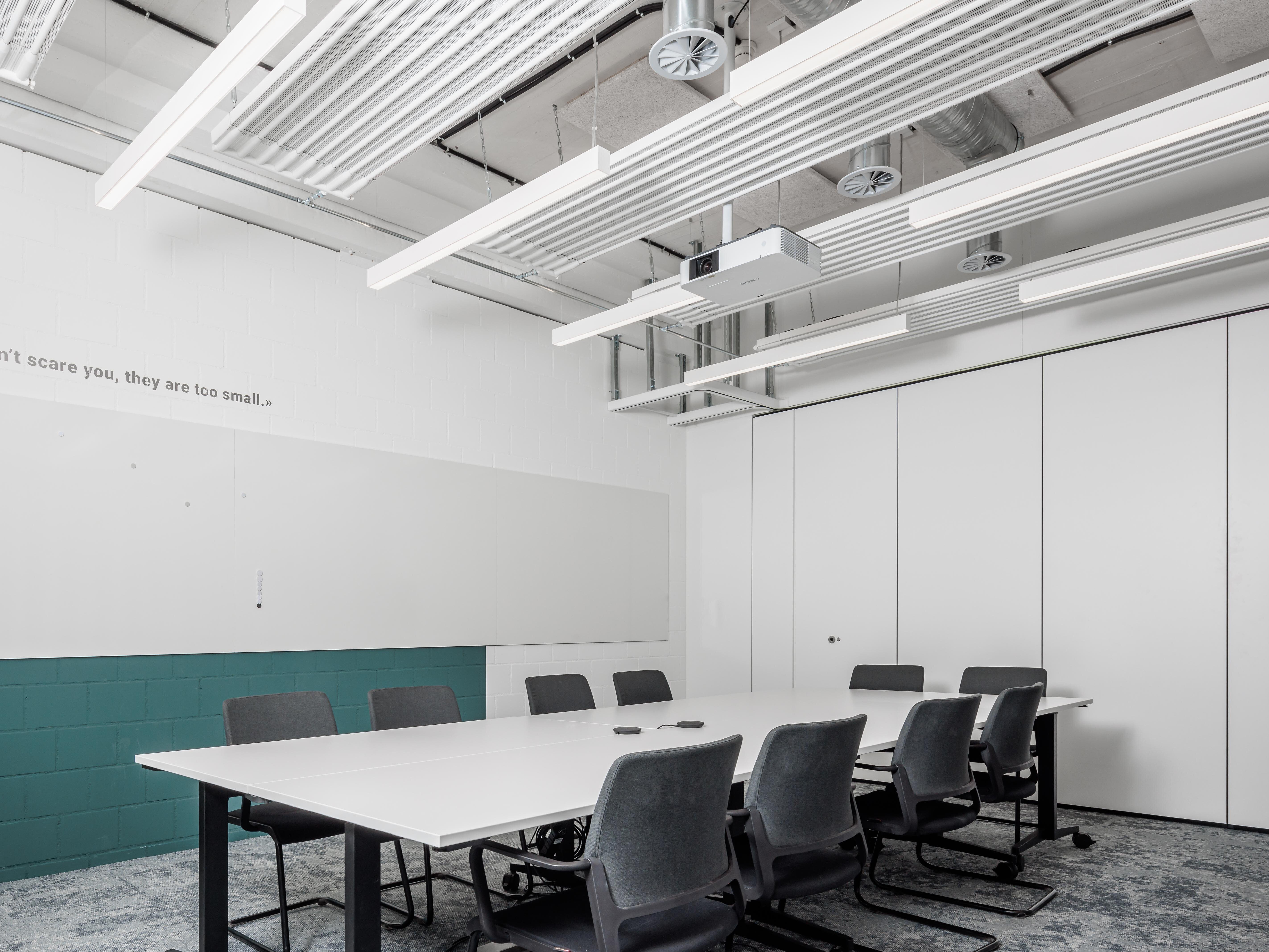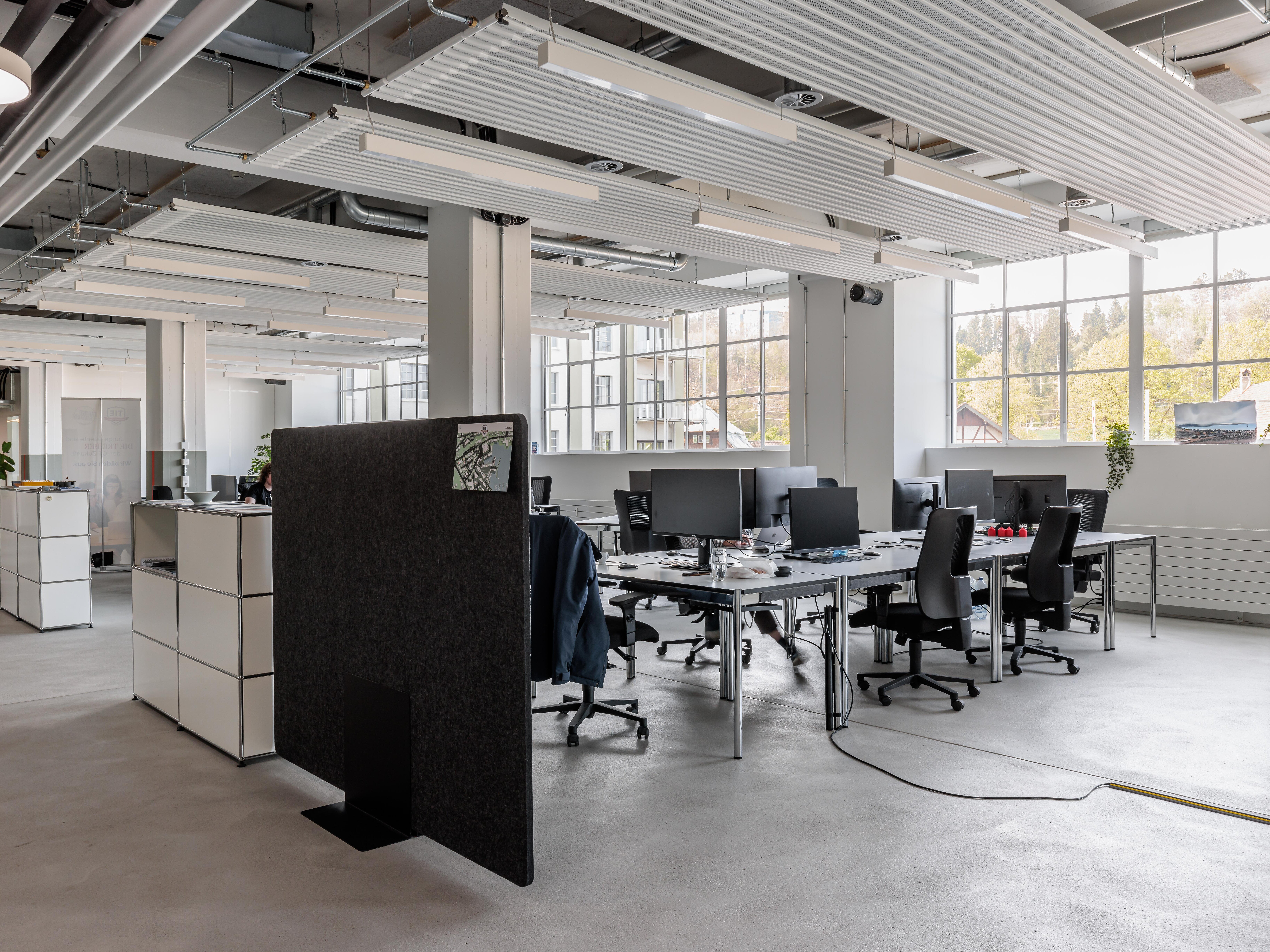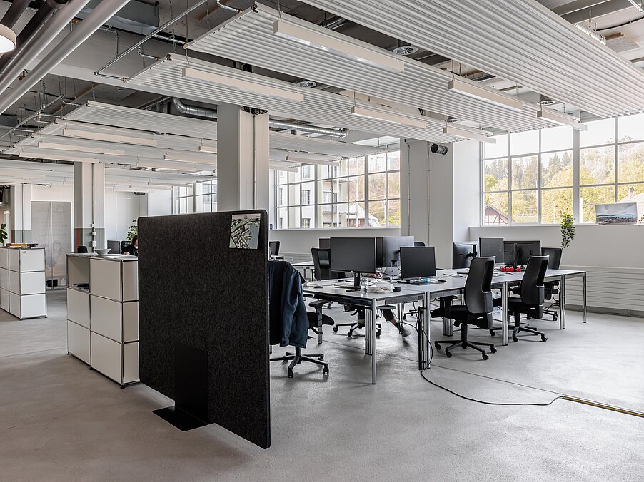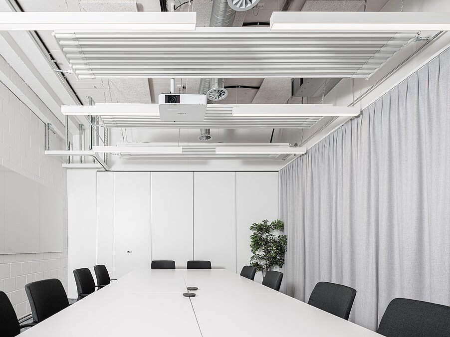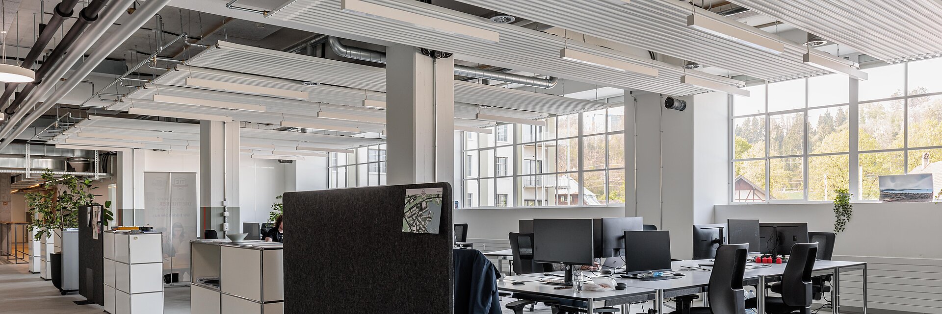 Die Deckenstrahlplatten Zehnder ZFP konnten dank ihrer modularen Bauweise individuell kombiniert werden. In unterschiedlichen Breiten von 450 bis 1.200 mm liessen sich die Module bedarfsspezifisch je nach Raumgrösse, Kühlbedarf und optischer Gestaltung zuordnen. Das geringe Gewicht der ZFP-Deckenstrahlplatten von nur 14 kg/m2 sowie die hohe Stabilität der Module erleichterte die Montage erheblich.