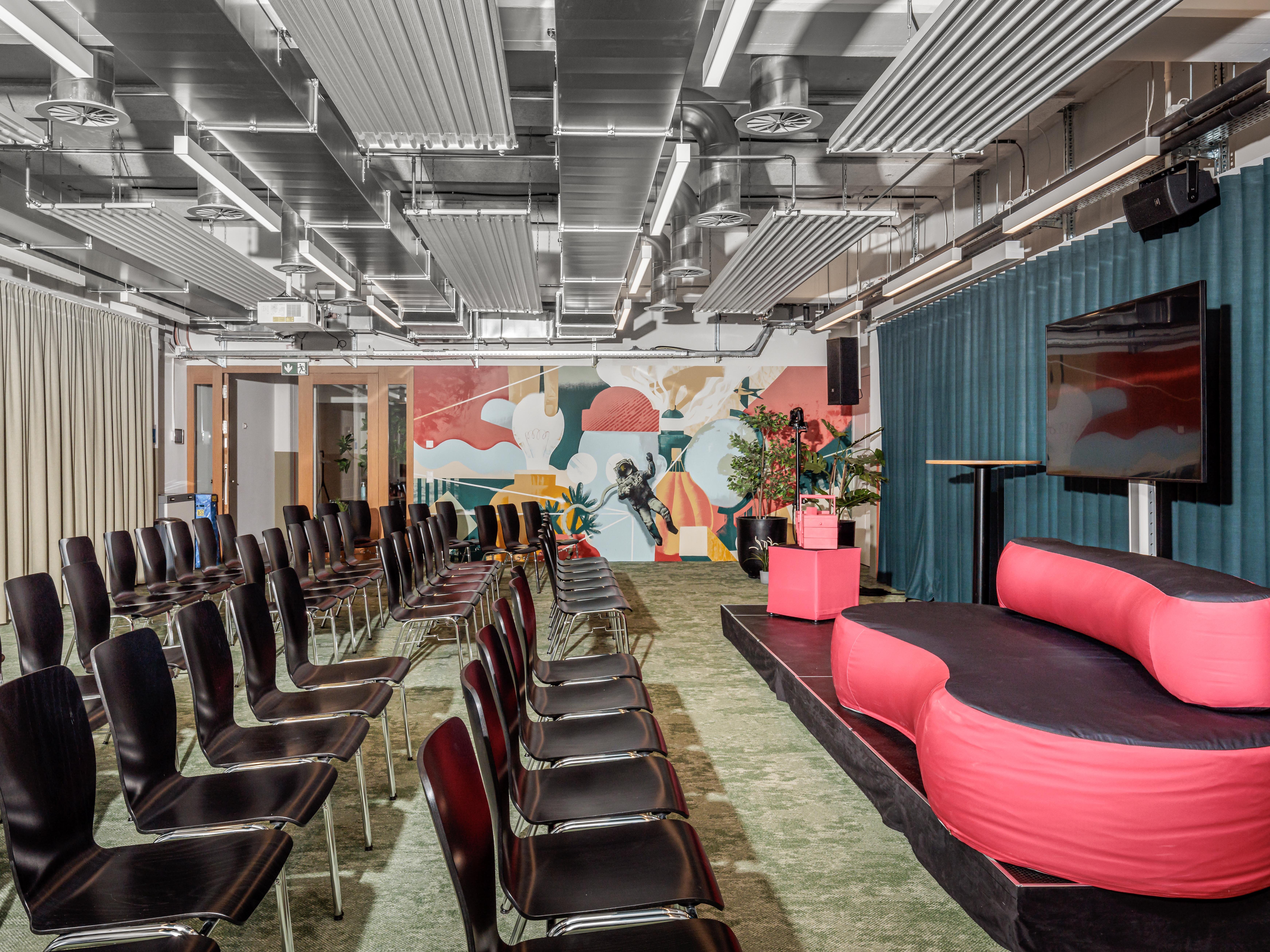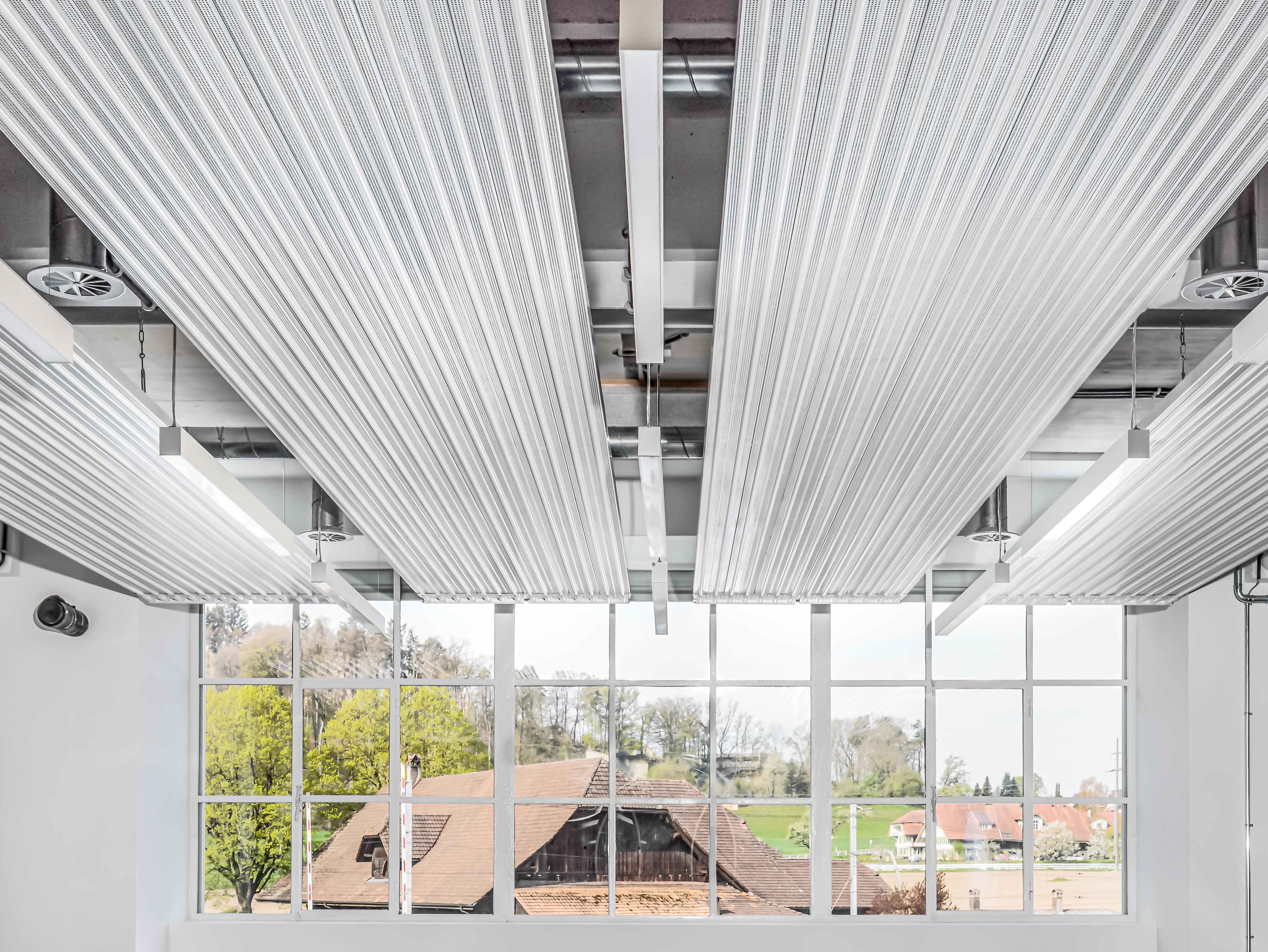 Die Deckenstrahlplatten wurden in zwei Bauetappen 2020 und 2022 montiert. Insgesamt installierte Zehnder rund 800 lfm gelochte Deckenmodule der neusten Generation ZFP mit einer Fläche von ca. 580 m2.