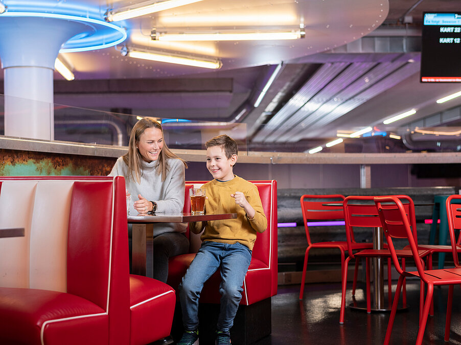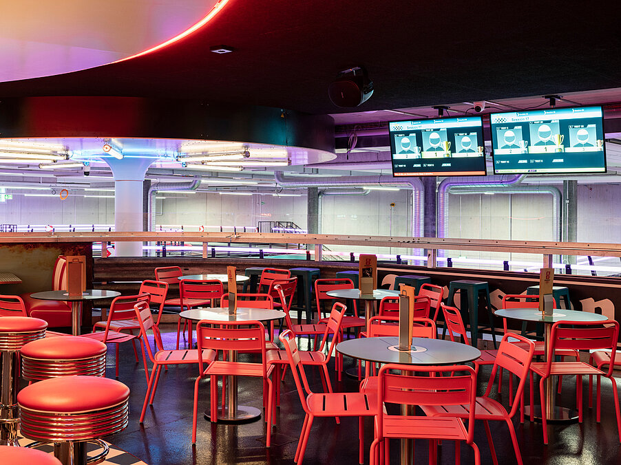 In der weitläufigen Fabrikhalle wurde im Untergeschoss eine doppelstöckige E-Kartbahn installiert, um den Besuchern ein aufregendes Fahrerlebnis zu bieten. Eine grosse Installationsfläche ermöglicht eine behagliche Beheizung der voluminösen Räumlichkeiten. Das warme Wasser durchströmt die Deckenstrahlplatten und heizt den grossen Raum energieeffizient.